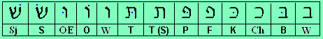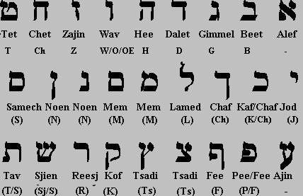 Het Hebreeuws en het Jiddish gebruiken een ander alfabet dan het Nederlands. Hieronder staan de Hebreeuwse letters afgebeeld, in Hebreeuwse alfabetische volgorde. Let op: het Hebreeuws wordt van rechts naar links geschreven, in plaats van het Nederlands dat van links naar rechts geschreven wordt. Dus de Alef is de eerste letter van het Hebreeuwse alfabet en de Tav is de laatste. Letters van het Alefbeet